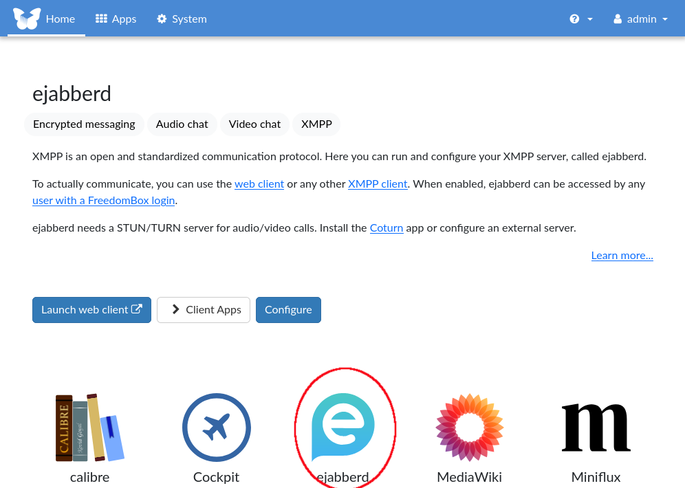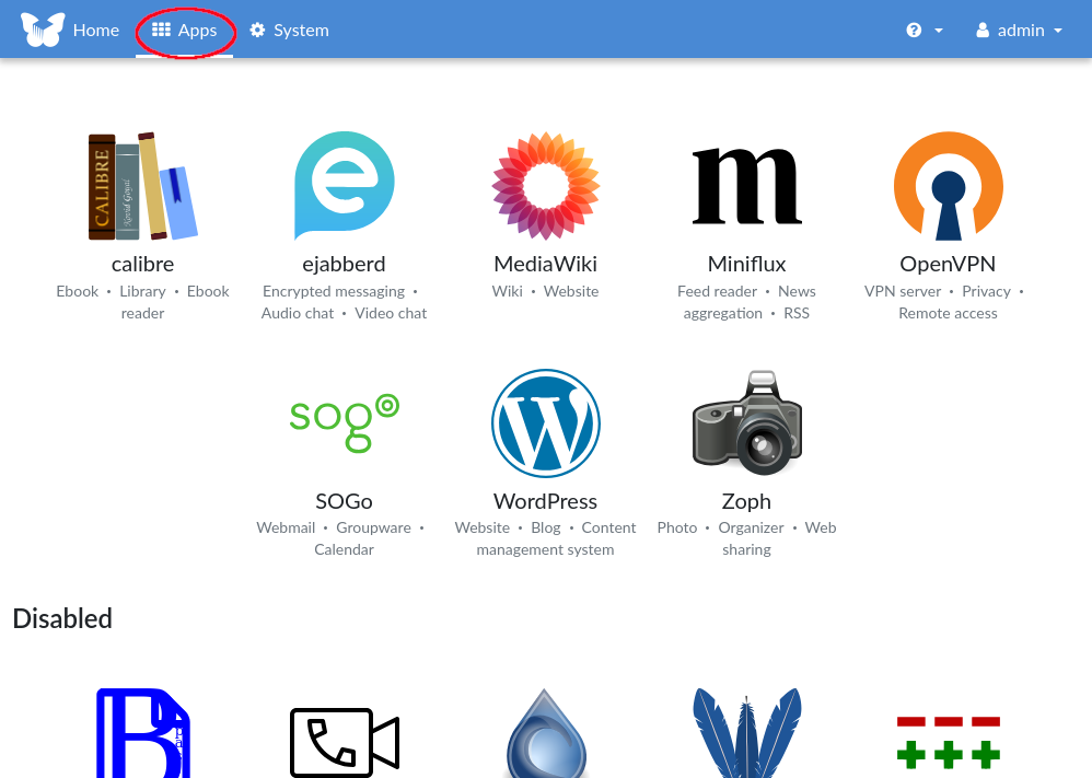 The Apps menu can be accessed by clicking the grid icon, next to the FreedomBox logo. This page lists all of the apps that are available for installing on FreedomBox. Click the name of an app to visit its page, where you can install and configure it. Currently installed and enabled apps are shown above the remaining available apps.