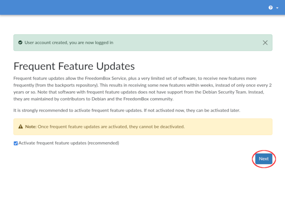 After completing the form, you will be logged in to FreedomBox’s web interface and asked if you wish to receive more frequent updates (recommended).