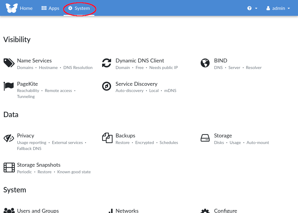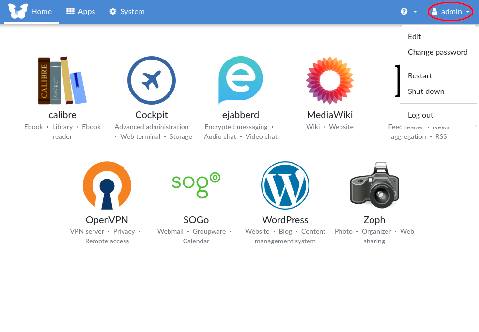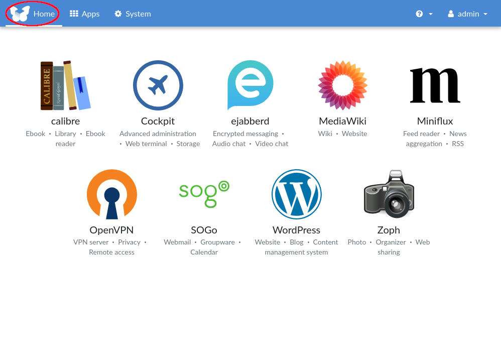 The front page is the page that you will see when accessing the web root of your FreedomBox. You can also access it by clicking the FreedomBox logo in the top-left corner of the FreedomBox’s web interface.