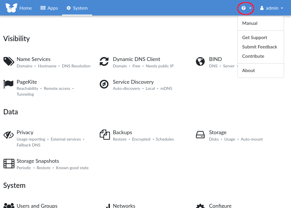 A drop-down Help menu can be accessed by clicking the question mark icon near the top-right corner. The menu includes helpful links and the FreedomBox manual.