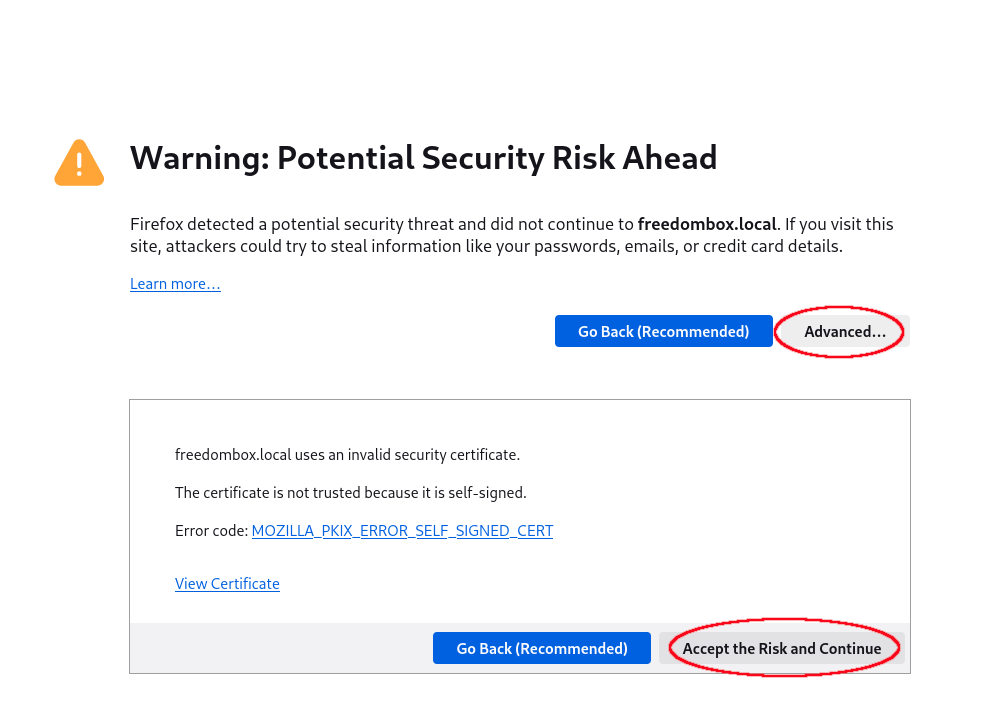 On accessing FreedomBox’s web interface your browser will warn you that it communicates securely but that it regards the security certificate for doing so as invalid. This is a fact you need to accept because the certificate is auto generated on the box and therefore “self-signed” (the browser might also use words such as “untrusted”, “not private”, “privacy error” or “unknown issuer/authority”). Telling your browser that you are aware of this might involve pressing buttons such as “I understand the Risks”, “proceed to … (unsafe)” or “Add exception”. After the initial setup this certificate can be changed to a proper one using the Let’s Encrypt.